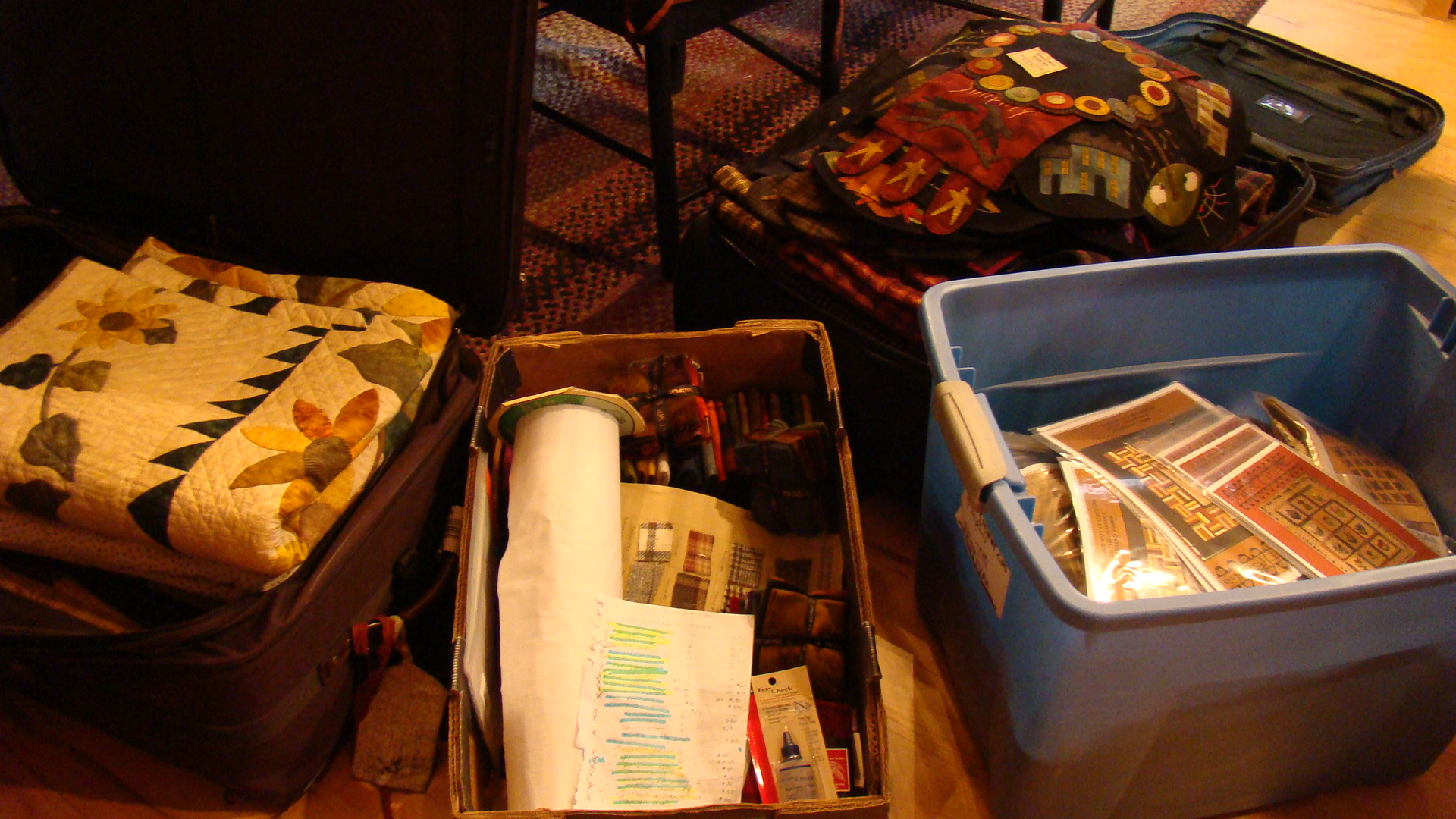 here is a peak at the quilts and wool things being packed for the trip on Sunday… Nick is worried about the weather, after his drive home from CA in all that mess…we escaped CA just in time…hope all our “friends” are doing OK… it was a great time at Road To California…I will be filling out a teaching form for next year…so hope to see you in a class, if you can.