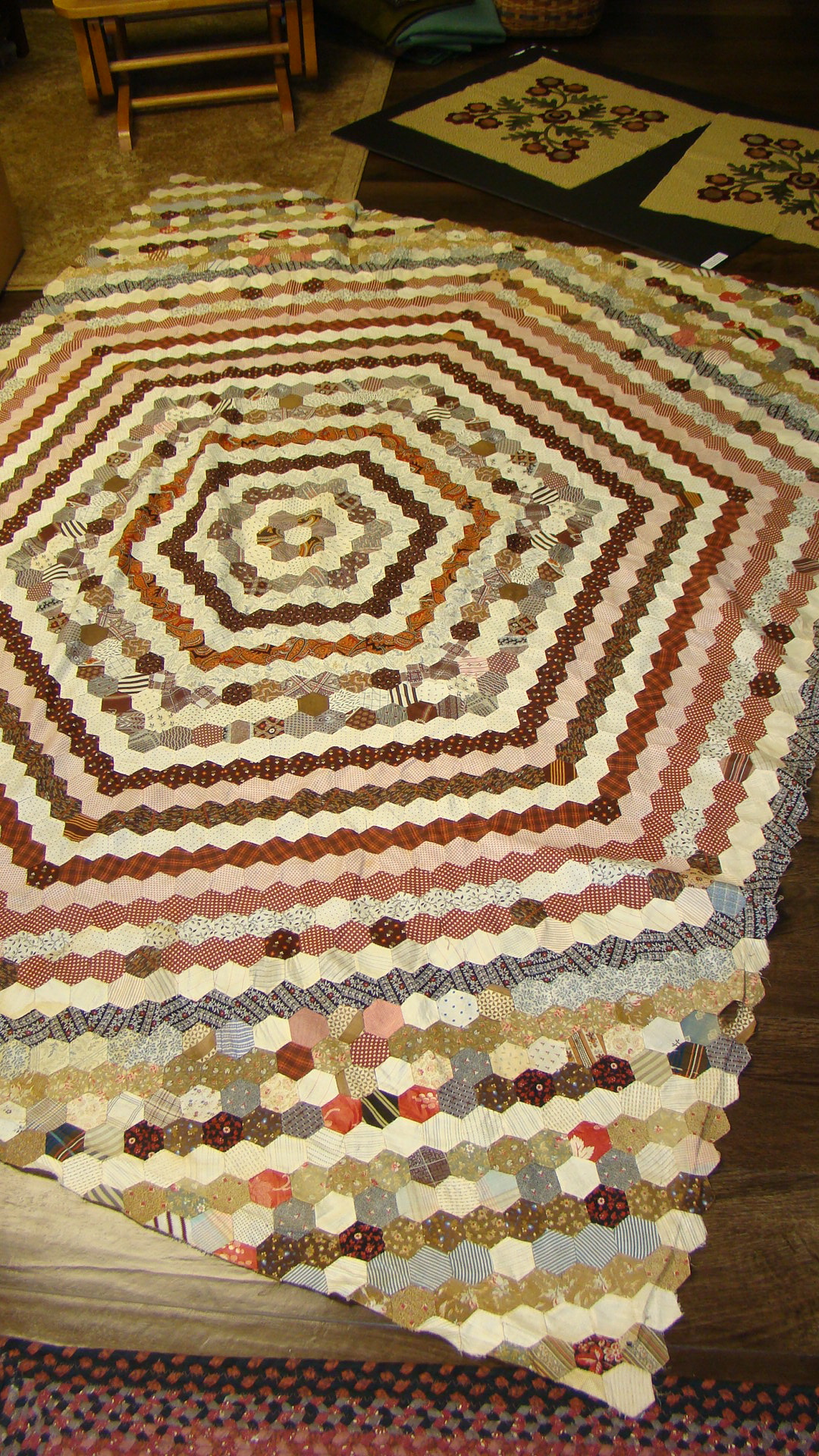 I am also packing projects to sew and getting things fused when an ebay package arrived…look what was in the box..a scrap hexegon quilt top! It is in fairly good shape..along with a note from one of the family members from 1968 passing in on to a relative for her to quilt. It said the quilt has been in the family for awhile and that is was used in a “puff”…I think that means like a duvet, because i can see some left over stitching just around the edge.
