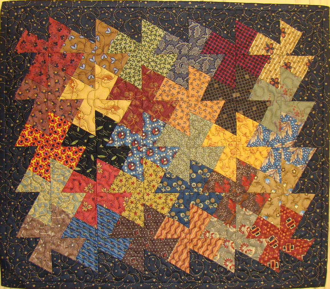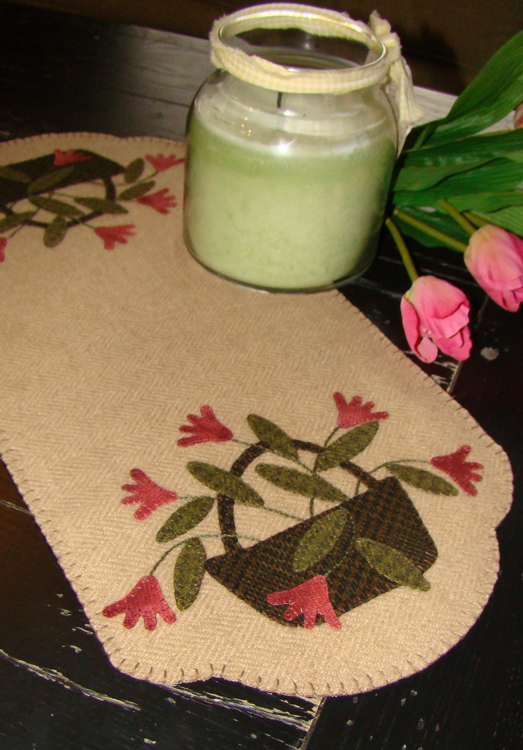 Well I am at 1 day now with out any sugar…after the “cake fest” I think I need to sacrifice a few days and not even have my usual Dove dark chocolates…but I will survive and hopefully those 5lbs will magically disappear before I know it…who am i kidding…i will have to do extra workouts…but anyway….Here are a few more items that are new offerings at Fall Market/Festival…Tulip Basket is 8×18 and is perfect for a gift or to keep all for yourself. $7 pattern and $18 kit w/pattern. All hearts come home for Christmas is also a perfect gift with a candle, little tree skirt for your little tree. There is not a lot of wool in this one, but the stitchery is fun and it goes fast. Pattern $8, kit w/pattern $25. All wool mats include backing also… then there is the Primitive Pinwheels…this is a fun little quilt that is made using a twister template. just sew squares together, cut your the squares using the template, piece the “new” squares back together and you get this. You also could add another border if you wish.. $10 for pattern with plastic template and $20 for kit/pattern with pre-cut 3 1/2″ squares.
