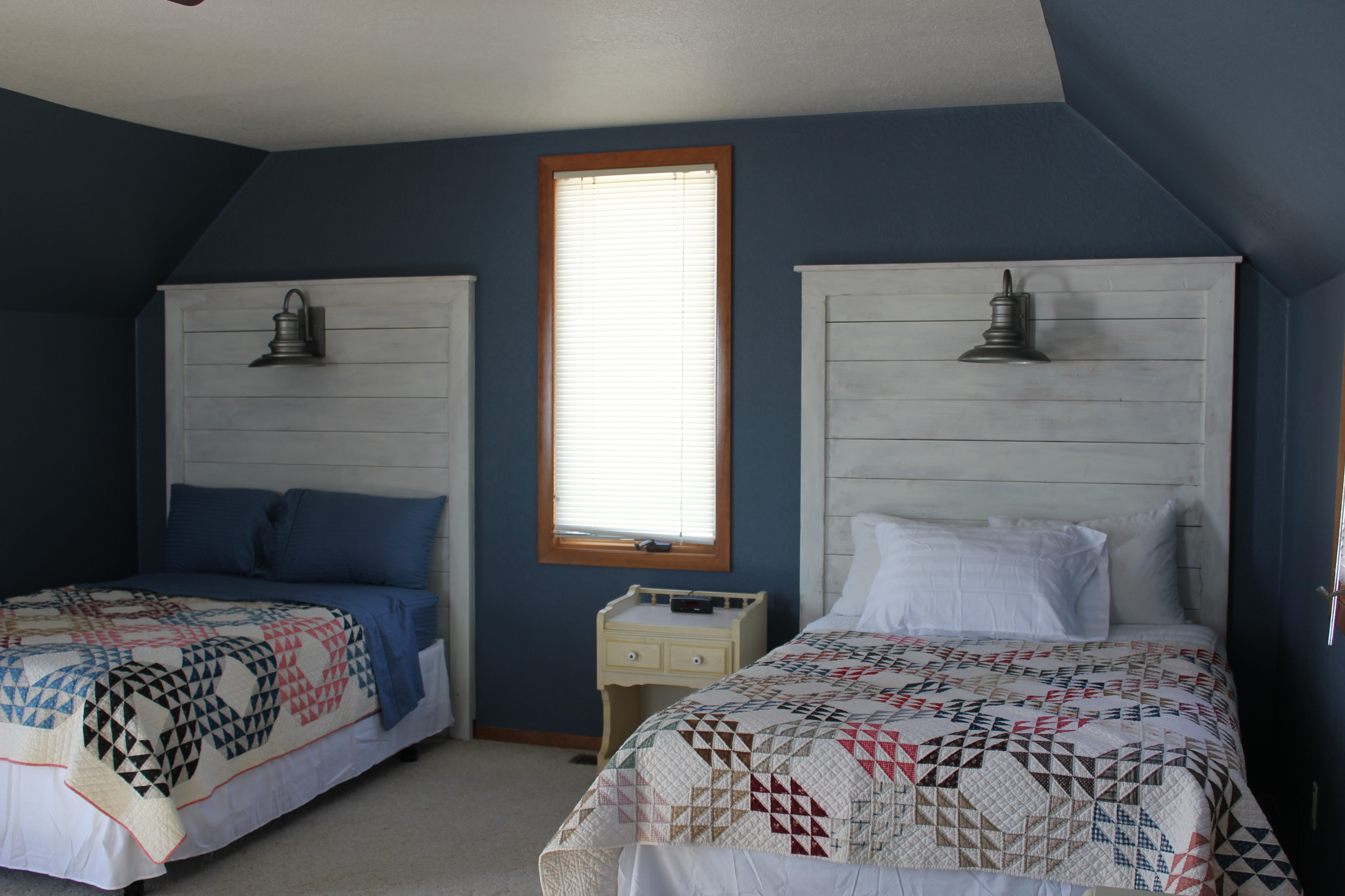 g room…Then the upstairs is one open loft…It was painted a nice blue and my cousin Rick made me these “old looking” head boards with the industrial lights in them…I just love how these turned out…I need to find something better than those dust ruffles…but the antique quilts sure add a big impact to this room!!!