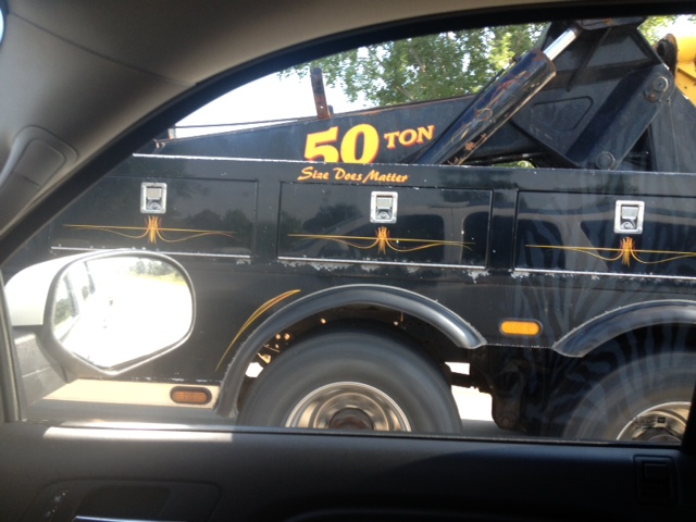 I am supposed to talk about how size matters….well… I was thinking about this as I was driving…and guess what pulls up beside me? A big o’l truck wrecker…the one that picks up disabled trucks and brings them back home safely…and as I am thinking about the blog hop and wondering what I am going to write about…I noticed this on the the truck…Size Does Matter….