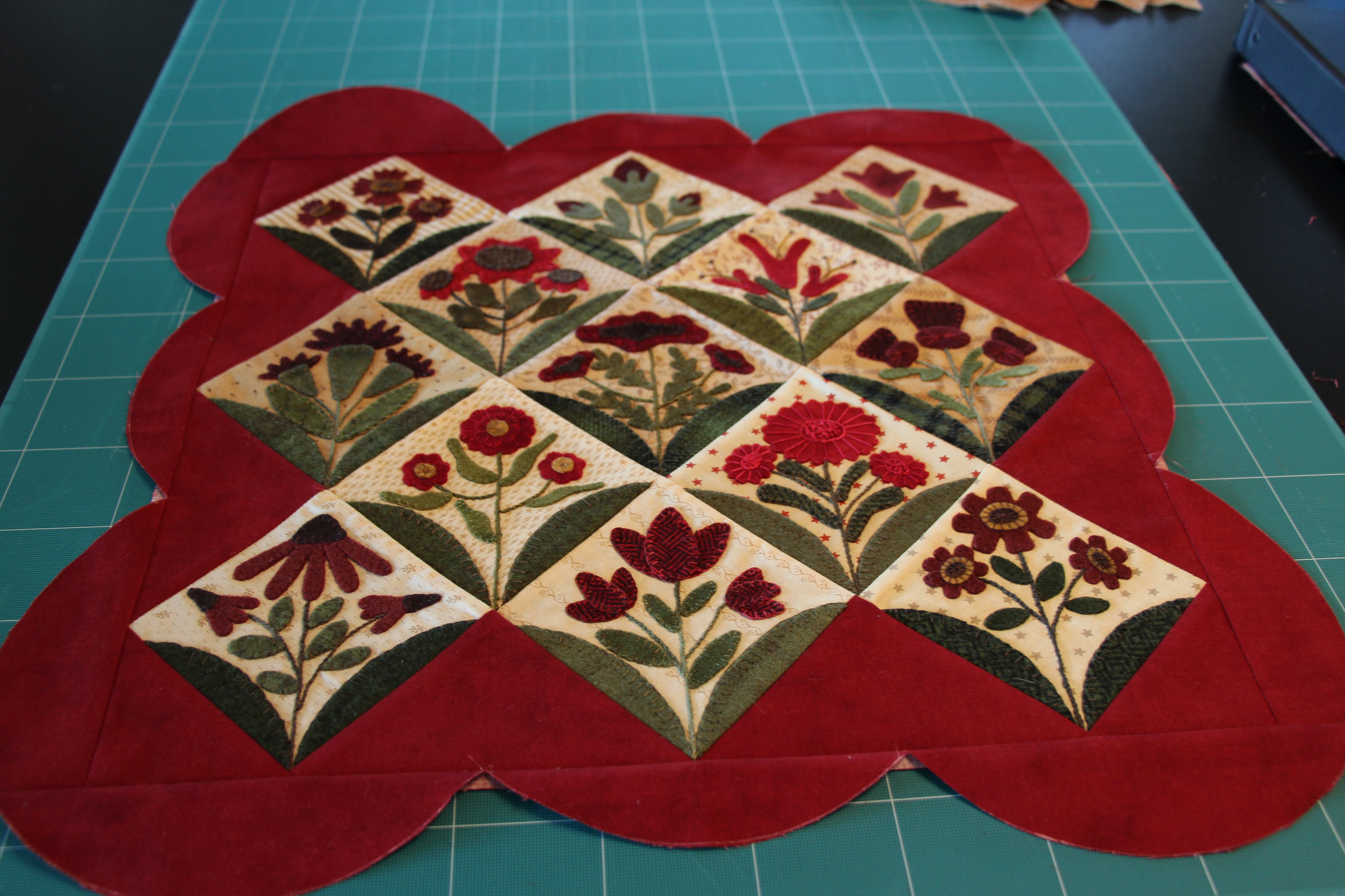 In the third photo I placed the top onto a tan print square, folded the top back and added little dots of Roxanne’s Glue on the edges. Then secured it flat onto the tan fabric. Then the last picture shows the vine placed on the edge of the two fabrics along with some new appliquéd flowers and some from the blocks.