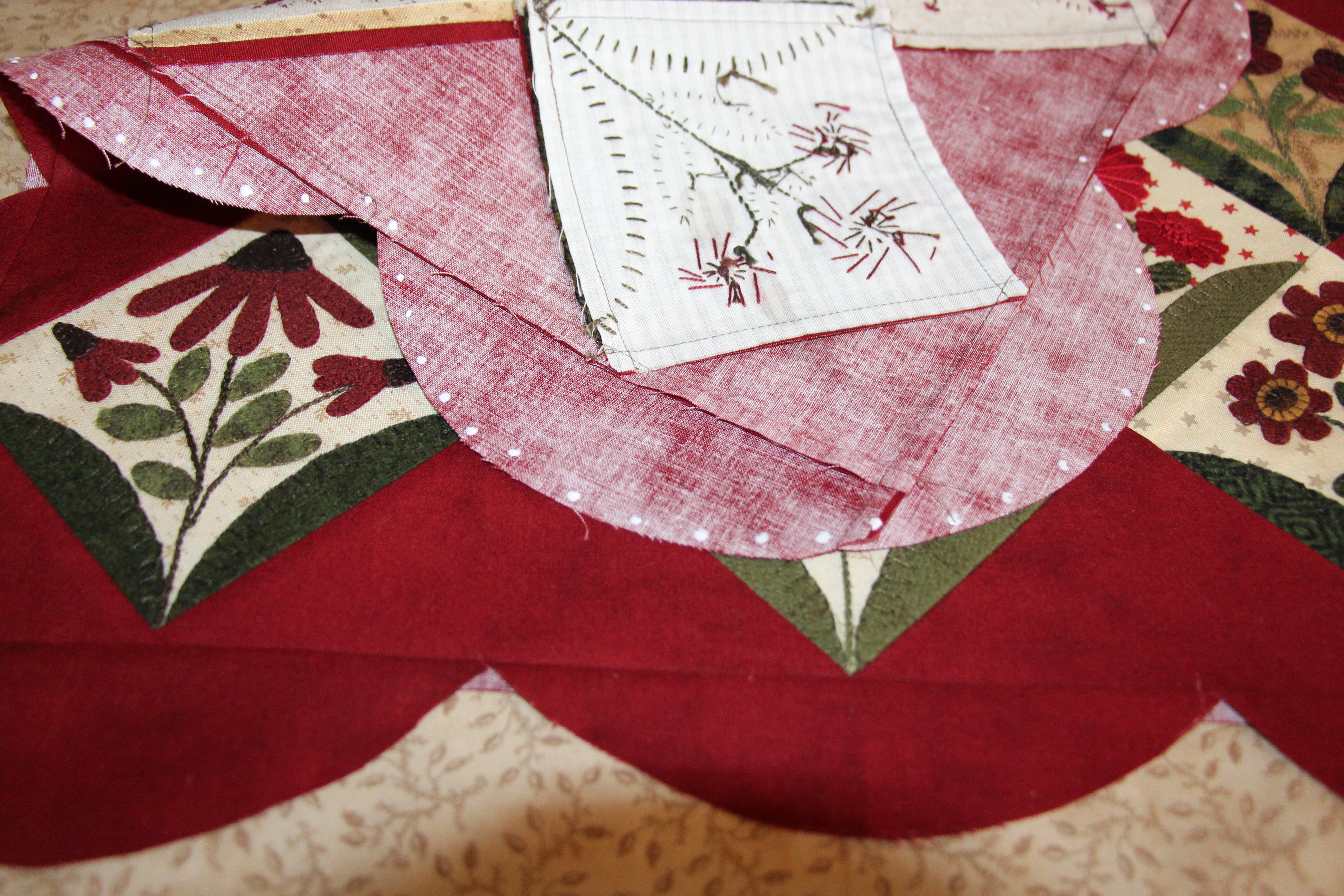 In the first photo I have stitched the setting triangles and the blocks together into rows, stitched the rows together and then added the borders…as you can see my borders did not have to be this big…but I have never done this before so I didn’t know…The finishing direction will tell you what size to cut your border to…I used a small plate to draw my curves….I have given you the curve in the pattern so no need to audition your plates like I had to do…Trace the curve with your Clover liquid chalk pen.