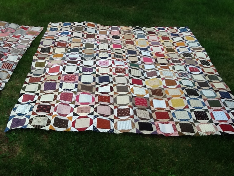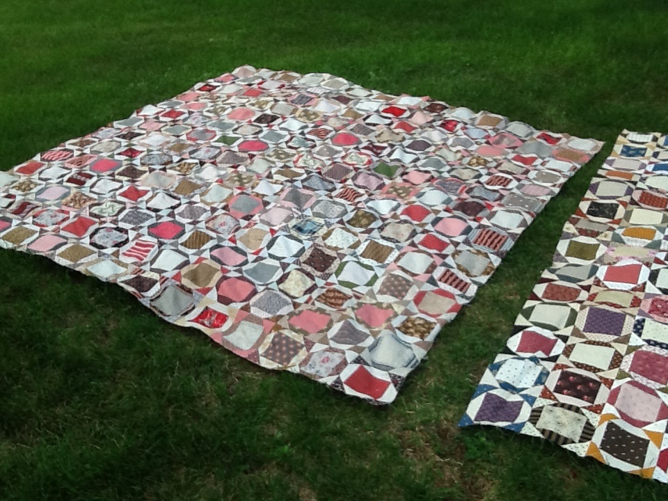 How is everyone doing on their PIECED BOW! As you can see mine is all pieced together…I thought I should show you how I put them together…and I am revealing the antique quilt top used for inspiration….In the first photo I am showing the two quilts side by side….the one on the left is the antique, the one on the right is the one from the BOW. The new quilt is a little more colorful but I love how it turned out…I thought I would show you it before it was sent off to the machine quilter….the antique has some wonderful fabrics…it has a lot of pinks and reds and no blue…there are some very large scale prints that look like wall paper… Click on the photos to make them larger.