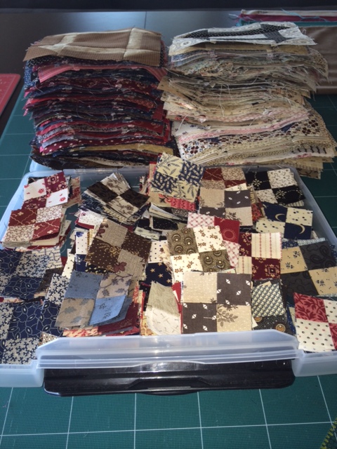 I have all 168 blocks done…and 268 4-patches…plenty for some sort of border…now are you keeping up? come on…You can do another 12…thats what I did…I was waiting for my 12 fabrics from the girls…and some I was making 24 because I was gone that week…but here they are all ready to put together…I wonder how long that will take..Instead of rows I’m going to stitch 9 or 12 patch blocks of blocks…then stitch the large blocks together…does anyone else not like stitching rows? I think what I dislike the most is laying out the rows…trying not to get the same fabrics together…which always happens anyway…Hopefully I will have it all together by the time you get your last 12…