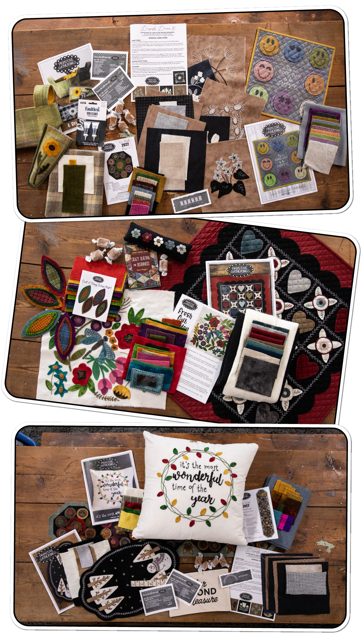 If you’re not familiar with how the Subscription Wool Box works, don’t worry. It’s super easy to sign up! Boxes are released and conveniently delivered to your door every other month. They focus primarily on wool and stitchery projects and contain as close as we can get to $100 worth of wool-based goodies. These coveted boxes are made up of all new projects that have not been previously released, including at least one major project kit and pattern, a pattern for an ongoing project, novelties, and more! Our Wool Boxes consist mostly of Primitive Gatherings products and patterns, but we may also have guest designers and products as well in future boxes. Still need more convincing? Just take a look at a couple of examples of what boxes have looked like in the recent past…